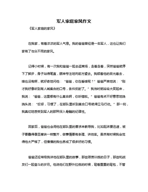 军人家庭家风作文《军人家庭的家风》在我家,那可是有一股特别的风气,因为我们家是军人家庭嘛。