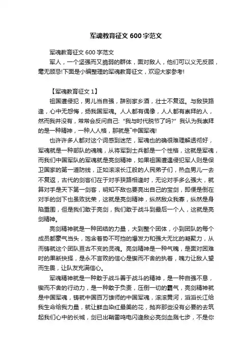 军魂教育征文600字范文军魂教育征文600字范文军人,一个坚强而又脆弱的群体,面对敌人,他们可以义无反顾,毫无顾忌!下面是小编整理的军魂教育征文,欢迎大家参考!【军魂教育征文1】祖国遭侵犯,男儿当自强,辞别家乡酒,壮士不复返。