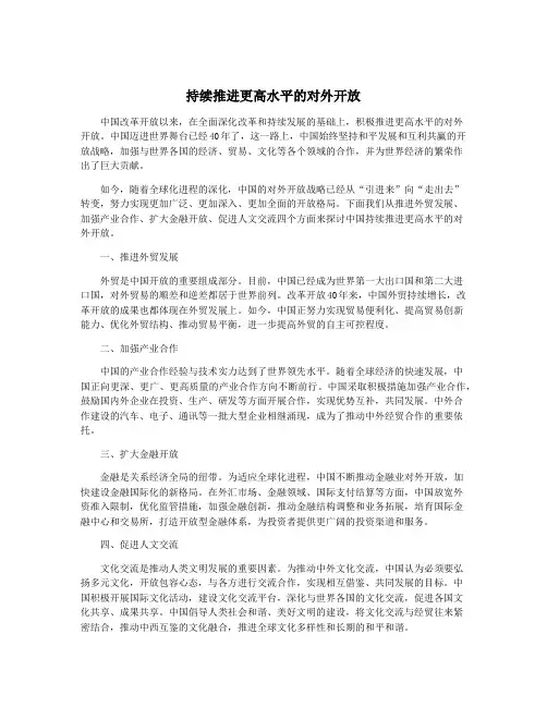 持续推进更高水平的对外开放中国改革开放以来,在全面深化改革和持续发展的基础上,积极推进更高水平的对外开放。