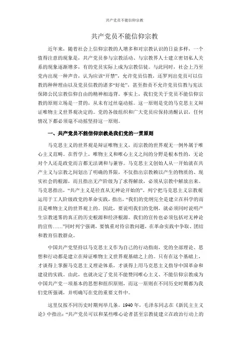 一、共产党员不能信仰宗教是我们党的一贯原则马克思主义的世界观是辩证唯物主义,而宗教的世界观无一例外属于唯心主义范畴。