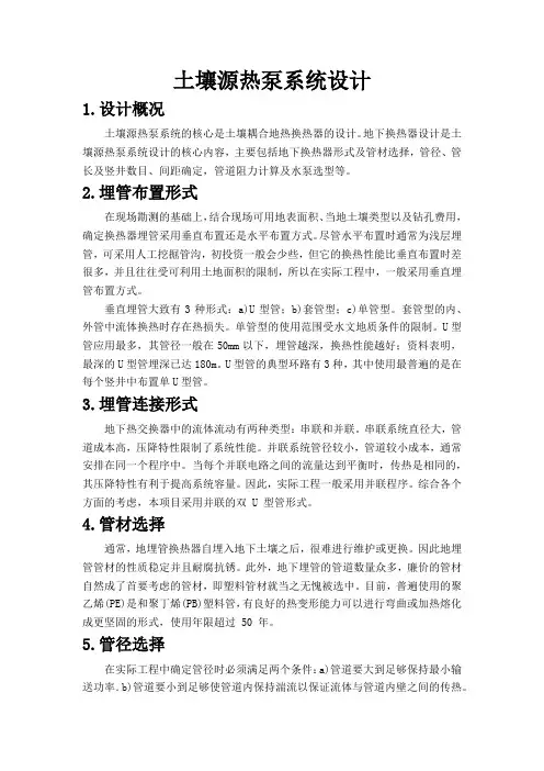 土壤源热泵系统设计1.设计概况土壤源热泵系统的核心是土壤耦合地热换热器的设计。