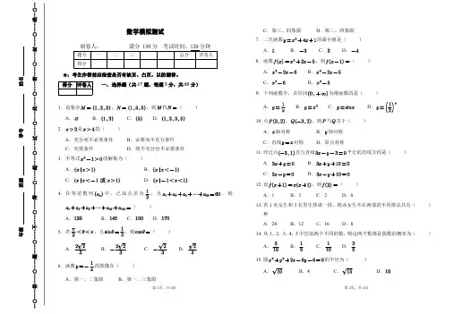 第1页,共4页第2页,共4页年级班级学号姓名…○……答……○……题……○……不……○……得……○……超……○……过……○……此……○……密……○……封……○……线…○…数学模拟测试制卷人:满分150分考试时间:120分钟题号一二三总分评卷人得分☆:考生作答前应检查是否有缺页、白页,以防漏答。