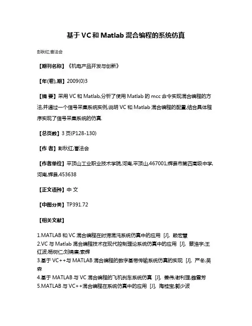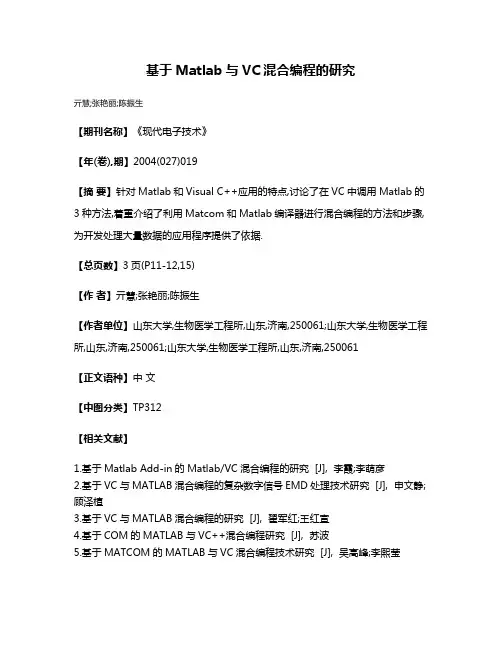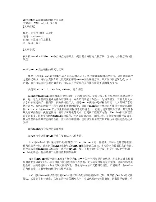 VC++与Matlab混合编程的研究与实现关键词: VC++,matlab,混合编[文章信息]作者: 朱立松帅亮安居白时间: 2004-10-07出处: 计算机与信息技术责任编辑: 方舟[文章导读]在分析Visual C++和Matlab各自特点的基础上,提出混合编程的几种方法,分析对比各种方案的优缺点VC++与Matlab混合编程的研究与实现摘要在分析Visual C++和Matlab各自特点的基础上,提出混合编程的几种方法,分析对比各种方案的优缺点。