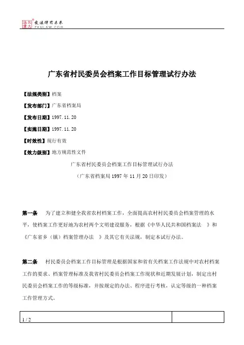 第二条村民委员会档案工作目标管理是根据国家和省有关档案工作法规中对农村档案工作的要求、档案管理标准及我省村民委员会档案工作现状和近期发展计划,制定出村民委员会档案工作的等级标准,并按规定的办法、程序进行考核,认定等级的一种档案工作管理方式。