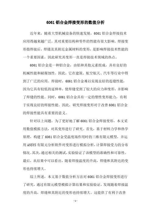 6061铝合金焊接变形的数值分析近年来,随着大型机械设备的快速发展,6061铝合金焊接技术应用得越来越广泛,其对重要结构和零件的性能有很大影响。