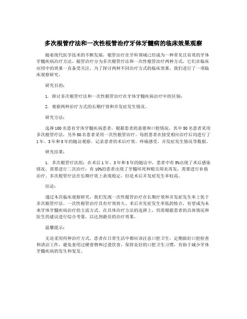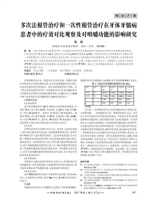 多次根管疗法和一次性根管治疗牙体牙髓病的临床效果观察1. 引言1.1 研究背景根管治疗是一种常见的牙体牙髓病治疗方式,它通过清除牙体内的感染物质和保留牙根,来保持患牙的功能和美观。
