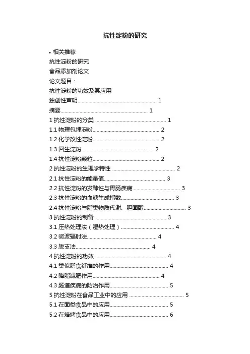 抗性淀粉的研究•相关推荐抗性淀粉的研究食品添加剂论文论文题目:抗性淀粉的功效及其应用独创性声明 (1)摘要 (1)1抗性淀粉的分类 (1)1.1物理包埋淀粉 (2)1.2化学改性淀粉 (2)1.3回生淀粉 (2)1.4抗性淀粉颗粒 (2)2抗性淀粉的生理学特性 (2)2.1抗性淀粉的能量值 (3)2.2抗性淀粉的发酵性与胃肠疾病 (3)2.3抗性淀粉的血糖生成指数 (3)2.4抗性淀粉与脂类物质代谢、胆固醇 (3)3抗性淀粉的制备 (3)3.1压热处理法(湿热处理) (4)3.2微波辐射法 (4)3.3脱支法 (4)4抗性淀粉的功效 (4)4.1类似膳食纤维的作用 (4)4.2降脂减肥作用 (4)4.3肠道疾病的防治作用 (5)5抗性淀粉在食品工业中的应用 (5)5.1在面类食品中的应用 (5)5.2在焙烤食品中的应用 (6)5.3在饮料及发酵制品中的应用 (6)5.4在保健食品中的应用 (6)6结束语 (6)参考文献............................................................ 7 致谢............................................... 错误!未定义书签。