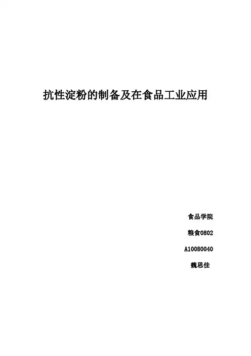 抗性淀粉的制备及在食品工业应用食品学院粮食0802A10080040魏思佳抗性淀粉的制备研究及其在食品工业中的应用论文关键词:抗性淀粉、分类、制备、生理功能、应用、食品工业论文摘要:抗性淀粉是近年发展起来的新概念,其功能特性引发了人们的研究兴趣,并成为国际上新兴的食品研究领域。