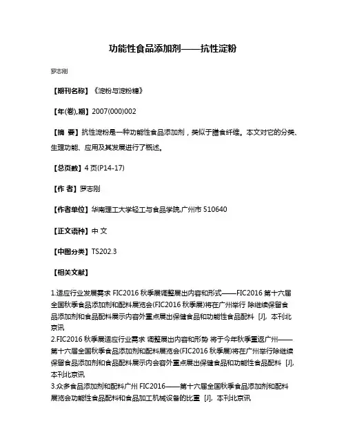 关键字:抗性淀粉生理功能食品添加剂应用前言抗性淀粉(RS)是近年来发展起来的新概念。