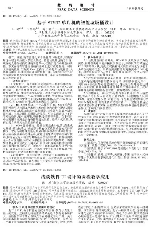 DOI:10.19551/ki.issn1672-9129.2021.10.063基于STM32单片机的智能垃圾桶设计王一航1,2㊀王若彤1,2㊀葛子轩1,3(1.华北理工大学机电创新设计实验室㊀河北㊀唐山㊀063210;2.华北理工大学以升创新教育基地㊀河北㊀唐山㊀063210;3.华北理工大学电气工程学院㊀河北㊀唐山㊀063210)摘要:这个项目是基于STM32单片机设计的智能垃圾桶,本项目将智能化和便捷化的设计理念㊂本项目分为无线感应模块㊁红外控制模块㊁蜂鸣器模块㊁温度感应模块以及数码管显示模块㊂可以实现人手靠近自动开盖㊁红外遥控控制开盖㊁满桶报警㊁温度检测与显示等功能,经过测试之后,产品功能稳定,智能化程度高,可以方便人们的生活,有一定的实用价值㊂关键词:单片机;无线感应;远程操控;智能化中图分类号:TP368.1;X799.3㊀㊀㊀文献标识码:A㊀㊀㊀文章编号:1672-9129(2021)10-0068-01㊀㊀引言㊂目前,随着智能化和个性化的不断进步,智能家居这一理念开始被大多数人接受㊂智能垃圾桶也随之出现,现存的大部分智能垃圾桶功能单一,仅能实现自动开盖的功能㊂本文在现有智能垃圾桶的基础上进行改进提高㊂利用无线模块检测,当距离30cm之内时,自动打开垃圾桶盖,人离开后闭合,也可以用红外遥控控制开闭㊂同时利用红外对管检测垃圾是否装满并实现装满报警㊂还可以实时将温度显示在数码管上㊂1㊀硬件系统设计1.1主控芯片㊂这个项目计划使用的一套半导体芯片,它具有微芯片的属性,因为它被称为单片机,即 单人芯片微电脑 ㊂通过多种通用交流方式,如USART㊁SPI等,可连接很多传感器,可以控制很多设备㊂现实生活中有许多我们大家都接触过的电子产品,例如智能手环㊁智能家居㊁智能车等等㊂在本项目中使用了STM32F103ZET6芯片,它高集成,低功耗,多IO的特点可以很好地满足项目需要㊂1.2㊀HC-SR04模块㊂本产品使用了HC-SR04超声波测距模块可以检测2厘米到4米的距离内的物体距离,测量精准度较高;此模块由超声波发射器㊁接收器与集成控制电路构成㊂主要应用包括测距,避障等㊂可以实现避障小车的障碍物检测,超声波测距,物体接近报警等功能㊂在本项目中主要用于检测是否有物体靠近垃圾桶㊂给单片机反馈,从而实现自动开关垃圾桶盖的功能㊂1.3㊀SG90舵机模块㊂舵机主要是由外包装㊁高集成电路板㊁低功耗马达㊁减速器与具有位置检测功能的元件所构成㊂它运行的原理是通过集成的接收器将信号传给舵机,再由驱动模块驱动电机运动,在通过齿轮结构带动机械臂转动,同时通过返回的信号判断是否摆动到位置㊂位置检测器是一个可变电阻,所以可以根据阻值不同来判断转角㊂物体转动惯量和质量成正比例关系,所以可以推断出推动物体转动的力和质量也成正比㊂舵机为了追求小功耗所以设计成空心,这就是空心杯马达㊂在本项目中主要用于接收单片机传输的信号,带动垃圾桶盖得打开和关闭㊂1.4红外对管㊂红外对管是一种很常用的检测仪器,主要应用于红外发射管和红外接收管㊂具有成本低,灵敏度高,稳定性高的特点㊂在本项目中主要应用于垃圾高度的检测,以实现垃圾装满提示的功能㊂2㊀软件系统设计2.1垃圾桶盖的自动开关㊂HC-SR04无线模块作为检测器,向外发出超声波并接收反馈信号,并将反馈信号通过PC2口传给单片机,通过代码换算将反馈信号转化为以毫米为单位的距离信息㊂如果检测到物体距离距离小于300毫米㊂将舵机标志位flag置1㊂舵机打角90度㊂维持4秒后将标志位清零㊂垃圾桶盖关闭㊂2.2红外对管检测垃圾是否装满㊂红外对管原理简单,几厘米内检测到物体则传回高电平,否则传回低电平[1]㊂利用PB2接收红外对管返回信号,当垃圾与红外对管达到同一水平位置,则将高电平通过IO口反馈给单片机㊂此时单片机会将将蜂鸣器标志位置1,使蜂鸣器发出提示㊂2.3寻迹移动㊂利用红外遥控与单片机通信,按下前进键,对两个电机输入相同的正转PWM㊂后退则输入反向PWM㊂左转令左轮反转,右轮正转,通过差速实现转向,右转则令右轮反转,左轮正转来实现右转[2~3]㊂定速巡航通过提前设定好轨迹来实现,主要需要设置的参数包括巡航触发条件,行进方向,转向位置等㊂3㊀结束语本项目在设计过程中出现了舵机模块选择动力不足导致无法开盖,此问题通过更换大功率舵机解决㊂还出现了差速转向垃圾桶桶体失衡的问题,几次尝试后通过加装辅助轮达成正三角稳定结构来实现㊂外壳设计采用PCB材质,成本低,硬度高,质量好㊂综上,我们所设计的智能垃圾桶可以满足人们对智能化,舒适化家居的需求㊂可以实现垃圾桶盖的自动开关,垃圾检测以及装满报警报警,自动寻迹的功能㊂具有一定的价值㊂参考文献:[1]沈勤丰.信息管理系统应用于静脉输液监护的研究与实现[J].软件工程师,2014,17(05):44-46+17. [2]张凌雪.基于STM32F103的智能小车设计[J].农家参谋,2020(23):106.[3]徐作成,黄姗,王菁华,吴雨霖,李渊.基于嵌入式的智能小车无线控制系统设计[J].轻工科技,2021,37(04): 109-110.DOI:10.19551/ki.issn1672-9129.2021.10.064浅谈软件UI设计的课程教学应用陈㊀鹏(浙江工贸职业技术学院㊀温州㊀325026)摘要:用户界面(UI)是用户与计算机软件之间的交互点㊂智能软件应用的成败取决于用户界面设计(UID)㊂使用软件的可能性㊁易用性和学习都受UID的影响㊂用户界面是教育软件(e-Learning)设计的重要组成部分㊂在电子学习的UID中,除UID原则外,还应考
