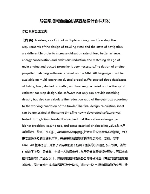 导管桨拖网渔船的机桨匹配设计软件开发陈虹;张晓君;王艺真【摘要】Trawlers, as a kind of multiple working condition ship, the requirements of the design of trawling state and the state of navigation are different.In order to increase utilization rate of fuel, better achieve energy conservation and emissions reduction, the matching design of main engine and ducted propeller is very necessary.The design of engine-propeller matching software is based on the MATLAB language.It will be available on multi-operating ducted propeller.We created three databases of fishing boat, ducted propeller, and host engine.Based on the theory of catheter oar map design, the software not only can provide matching design, but also can calculate the reduction ratio of the gear box according to the working condition of the trawler.The final design calculation sheet can be generated at the same time.The newly developed software was tested through 42m trawler.It is verified that the software design has higher precision, easy to use, and some practical engineering value.%拖网渔船作为一种多工况船舶,其拖网状态和自由航行状态的设计要求不尽相同。