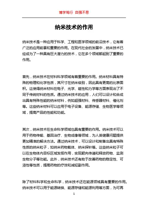 博学笃行 自强不息 1 纳米技术的作用 纳米技术是一种应用于科学、工程和医学领域的前沿技术,它有着广泛的应用前景和重要的作用。在现代社会的发展中,纳米技术已经成为了一种具有巨大潜力的技术,它在多个领域都起到了重要的作用。