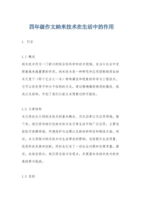 四年级作文纳米技术在生活中的作用1. 引言1.1 概述纳米技术作为一门新兴的综合性科学和技术领域,在当今社会中发挥着越来越重要的作用。