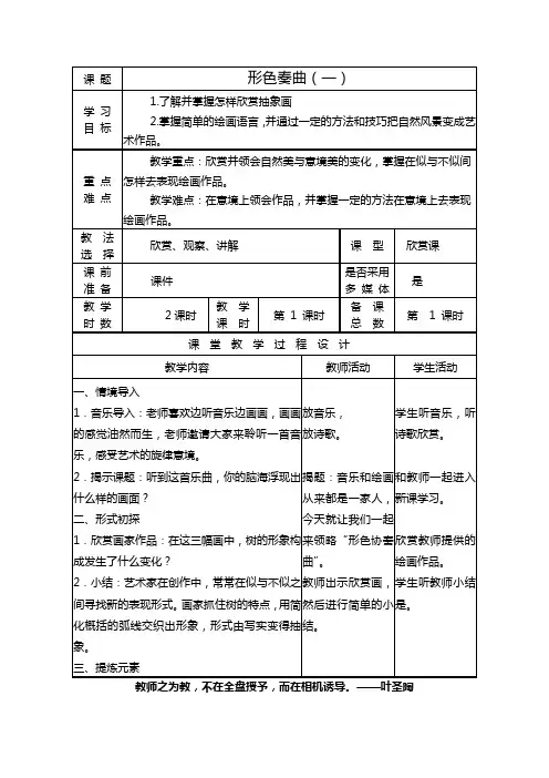 教学思路本课选择的是一个综合性的主题,教师应很清楚地了解本课涉及到哪些学科的相关知识,本课美术学科知识点的定位是什么,怎样巧妙地将各个知识点糅入到整体教学中去。