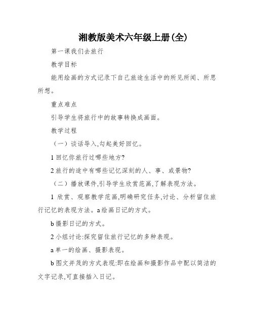 六年级上册美术《我们去旅行》两课时教案一、教学目标1. 让学生了解旅行的意义和乐趣,培养学生的观察力和想象力。