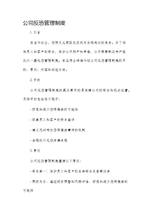 公司反恐管理制度1. 引言在当今社会,恐怖主义威胁已经成为全球关注的焦点。