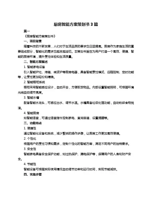 智能厨房方案策划书3篇篇一智能厨房方案策划书一、项目背景随着科技的不断发展,人们对于生活品质的要求越来越高,厨房作为家庭中重要的功能区域,也需要与时俱进,实现智能化升级。