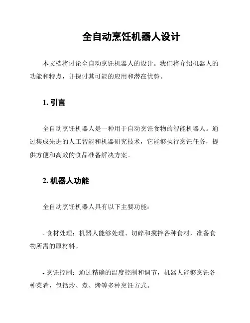 4. 产品特点和优势自动炒菜机具有以下特点和优势:- 多功能操作:自动炒菜机可以根据用户的需求和口味进行多种烹饪模式的选择,如炒菜、烧烤、蒸煮等,满足用户的多样化需求。