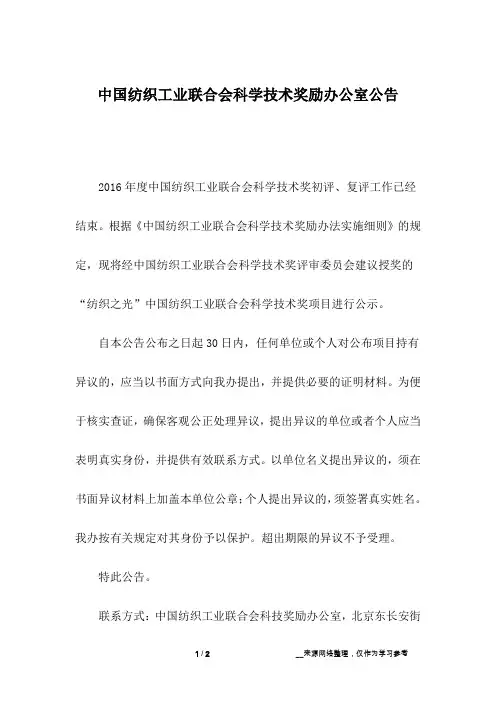 中国纺织工业联合会科学技术奖励办公室公告