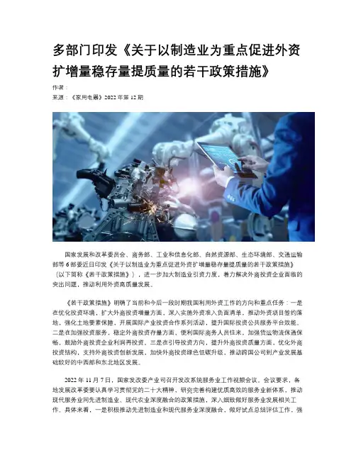 多部门印发《关于以制造业为重点促进外资扩增量稳存量提质量的若干政策措施》作者:来源:《家用电器》2022年第12期国家发展和改革委员会、商务部、工业和信息化部、自然资源部、生态环境部、交通运输部等6部委近日印发《关于以制造业为重点促进外资扩增量稳存量提质量的若干政策措施》(以下简称《若干政策措施》),进一步加大制造业引资力度,着力解决外商投资企业面临的突出问题,推动利用外资高质量发展。