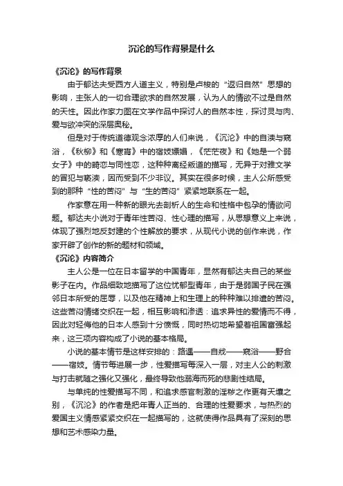 沉沦的写作背景是什么《沉沦》的写作背景由于郁达夫受西方人道主义,特别是卢梭的“返归自然”思想的影响,主张人的一切合理欲求的自然发展,认为人的情欲不过是自然的天性。