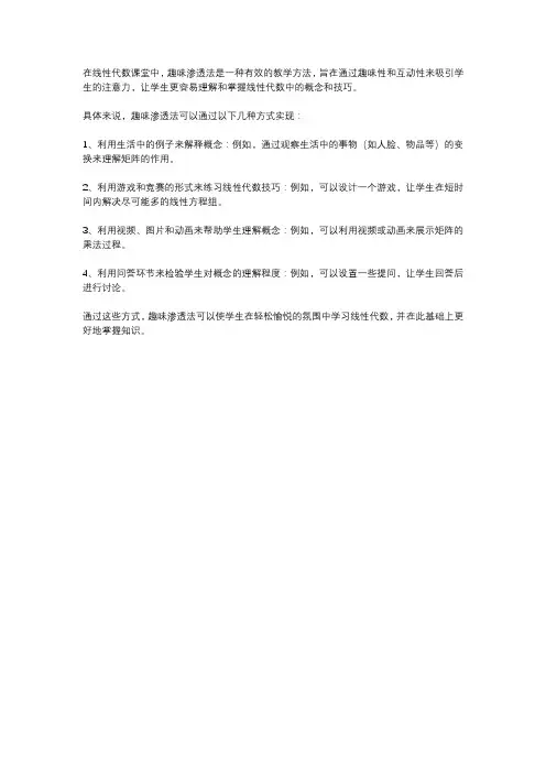 在线性代数课堂中,趣味渗透法是一种有效的教学方法,旨在通过趣味性和互动性来吸引学生的注意力,让学生更容易理解和掌握线性代数中的概念和技巧。