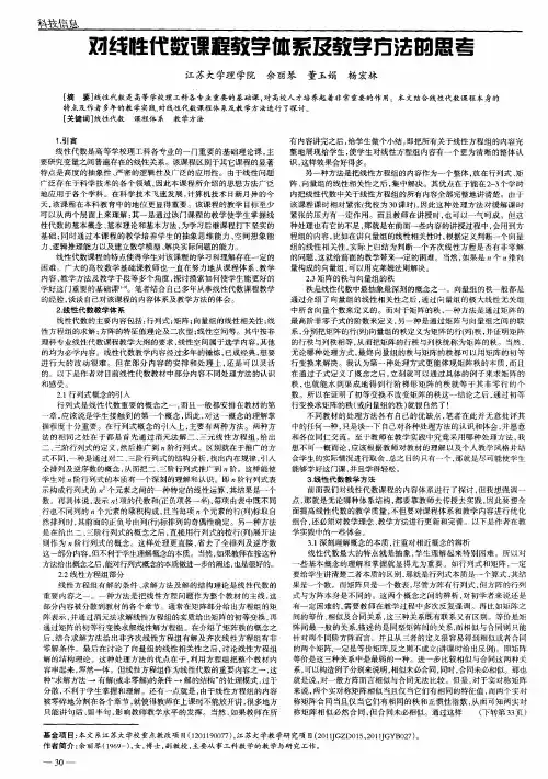 【关键词】线性代数矩阵的秩向量组相关性线性方程组1 引言同济大学编写的《线性代数》教材在我国工科院校被广泛使用,自1982年至今已经使用32年了,现在用的已经是第五版。