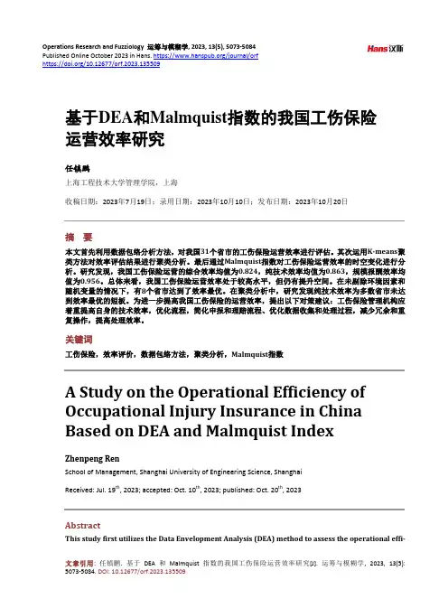 Operations Research and Fuzziology 运筹与模糊学, 2023, 13(5), 5073-5084Published Online October 2023 in Hans. https:///journal/orfhttps:///10.12677/orf.2023.135509基于DEA和Malmquist指数的我国工伤保险运营效率研究任镇鹏上海工程技术大学管理学院,上海收稿日期:2023年7月19日;录用日期:2023年10月10日;发布日期:2023年10月20日摘要本文首先利用数据包络分析方法,对我国31个省市的工伤保险运营效率进行评估。