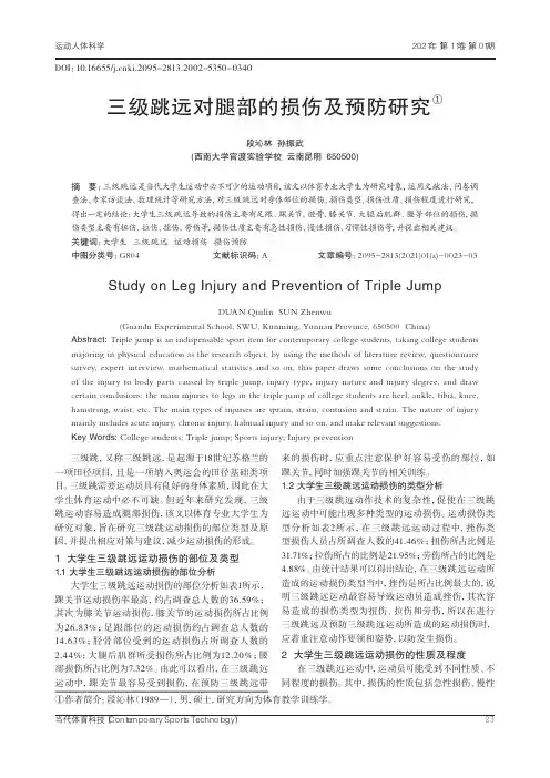 非周期性项目,技术复杂,要求运动员具有较高的速 度素质和爆发力素质。跳跃运动技术项目的运动特 点是:技术动作数量少,一般结构比较简单,高速度 的运动特点_1]。运动员在上板起跳的瞬间,腿部要 承受最大冲击力量一般可达自身体重的10多倍以 上。在三级跳远过程中,人体要承受地面很大的冲 击力,运动员肌肉、韧带、关节的损伤时有发生_2 。 一个运动员在努力提高自身运动成绩的同时,也要 拥有良好的自我保护力。高强度训练中对运动员的 肢体造成损伤的发生率也大大增加,严重的损伤不 仅关系到运动员的正常训练,而且对他们的生长发 育也会带来严重的影响_3]。本文对长春市业余体校 三级跳远运动员训练过程中运动损伤的人数、具体 部位、损伤原因及如何处理进行调查,通过分析加强 提高运动员预防损伤的意识,为青少年三级跳远运 动员运动损伤的预防提供参考。 1研究对象与方法 1.1研究对象 长春市三所业余体校40名三级跳远运动员(男 28人、女12人),年龄16—18岁。 1.2研究方法 1.2.1 文献资料法参阅大量的相关文献资料,结 合当前最新研究动向作为此篇论文的理论基础。 1.2.2问卷调查法根据研究的内容,结合专家意 见制定问卷,共发放40份问卷,回收40份,回收率 100 ,有效问卷40份,通过问卷了解长春市业余体 校三级跳远运动员运动损伤情况,并对运动损伤发 生的因素进行调查分析。 1.2.3数理统计法对回收的问卷资料进行整理 归类,并应用计算机软件进行设计处理。 2结果与分析 2.1运动损伤类型调查分析 从长春市业余体校三级跳远运动员运动损伤的 类型调查表来看,肌肉的拉伤在损伤中比例最大 43.8 ,其次为关节的劳损,占29.7 (表1)。出 现这种现象跟运动员的训练有密切的关系,过多地 进行了跳跃练习以及训练负荷是造成损伤的主要原