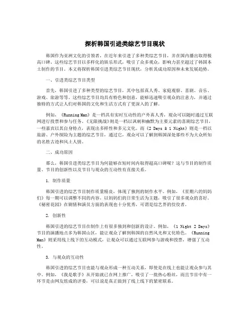 探析韩国引进类综艺节目现状韩国作为亚洲文化的引领者,在近年来引进了多种类综艺节目,并在国内播出取得极高口碑。