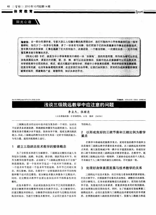 一、技术要点1.起跳阶段起跳是整个三级跳远过程的第一步,起跳的质量决定了后续的跳远飞行和着地。