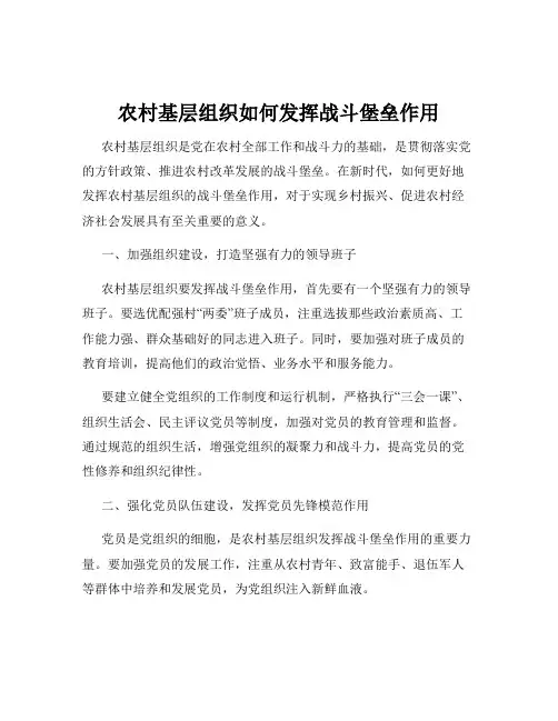 一、加强组织建设,打造坚强有力的领导班子农村基层组织要发挥战斗堡垒作用,首先要有一个坚强有力的领导班子。