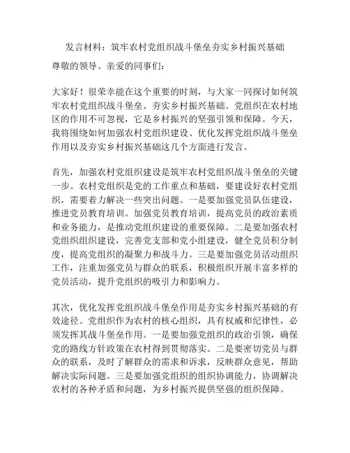 发言材料:筑牢农村党组织战斗堡垒夯实乡村振兴基础尊敬的领导、亲爱的同事们:大家好!很荣幸能在这个重要的时刻,与大家一同探讨如何筑牢农村党组织战斗堡垒、夯实乡村振兴基础。