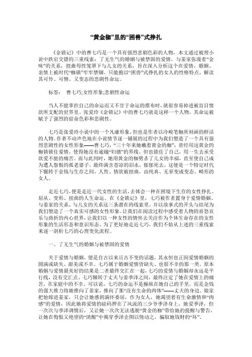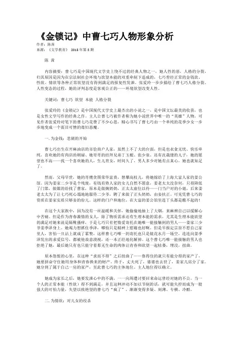 《金锁记》中曹七巧人物形象分析作者:陈茜来源:《文学教育》 2015年第3期陈茜内容摘要:曹七巧是中国现代文学史上绕不过的经典人物之一,她人性的恶,人格的分裂,归其原因是因为在宗法制社会环境与欲望本能的双重牵制下造成的,七巧曾经正常的金钱欲、性欲、情欲等各种正常欲望没有得到满足的报复性发泄。