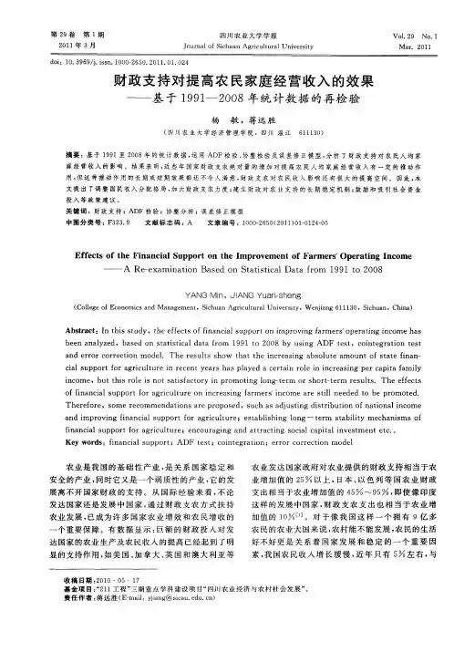 财政支农资金对农业产出的影响研究综述作者:付洪垒徐莹来源:《合作经济与科技》2017年第01期[提要] 财政支农支出是支持我国农业发展的有效途径。