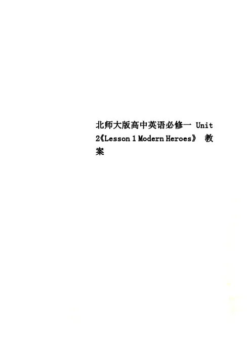 北师大版高中英语必修一Unit 2《Lesson 1 Modern Heroes》教案一、教学过程及分析教学步骤教学内容设计意图Step 1 Warming-up 1.Students watch a video clip of YangLiwei and ShenzhouV;3mins2.Introduce some information aboutChina’s Shenzh ou spaceships. (HandoutEx1)2mins1、播放神舟5号发射升空、杨利伟在太空与地面控制中心通话以及安全返回着陆的简短视频,迅速吸引学生注意力,激发兴趣,活跃课堂气氛;视频内容与课文大致相同,为下面阅读课文作铺垫;2、从神舟1号到神舟7号的知识介绍,增强学生对祖国的自豪感和激发强烈的爱国情怀。