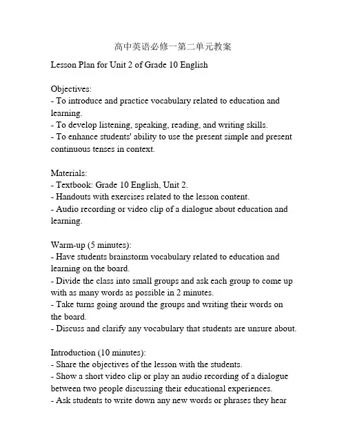 高中英语必修一第二单元教案Lesson Plan for Unit 2 of Grade 10 EnglishObjectives:- To introduce and practice vocabulary related to education and learning.- To develop listening, speaking, reading, and writing skills.- To enhance students' ability to use the present simple and present continuous tenses in context.Materials:- Textbook: Grade 10 English, Unit 2.- Handouts with exercises related to the lesson content.- Audio recording or video clip of a dialogue about education and learning.Warm-up (5 minutes):- Have students brainstorm vocabulary related to education and learning on the board.- Divide the class into small groups and ask each group to come up with as many words as possible in 2 minutes.- Take turns going around the groups and writing their words on the board.- Discuss and clarify any vocabulary that students are unsure about. Introduction (10 minutes):- Share the objectives of the lesson with the students.- Show a short video clip or play an audio recording of a dialogue between two people discussing their educational experiences.- Ask students to write down any new words or phrases they hearduring the listening activity.- Ask a few students to share their observations with the class. Vocabulary and Listening (15 minutes):- Provide students with a list of vocabulary words related to education and learning.- Ask students to match each word with its definition.- Play the audio recording or video clip again, if needed, and ask students to listen for the vocabulary words they have just learned. - After the listening activity, discuss the meaning and usage of the vocabulary words as a class.- Conduct a short listening comprehension activity, where students answer questions based on the dialogue they heard.Reading and Comprehension (20 minutes):- Provide students with a short reading passage about the importance of education.- Ask students to read the passage individually and then answer comprehension questions.- After giving students some time to complete the questions, discuss the answers as a class.- Encourage students to share their thoughts on the topic of education and its significance.Grammar Practice (15 minutes):- Review the present simple and present continuous tenses with the class.- Provide examples of sentences using these tenses in the context of education and learning.- Ask students to work in pairs and create their own sentencesusing the present simple and present continuous tenses.- Monitor the pairs and provide assistance if needed.- Ask some pairs to share their sentences with the class.Writing Activity (15 minutes):- Instruct students to write a short paragraph about their own educational experiences.- Encourage them to use the vocabulary words and tenses they have learned in the previous activities.- After giving students enough time to complete their writing, ask a few volunteers to share their paragraphs with the class.Wrap-up and Homework (5 minutes):- Recap the key points covered in the lesson.- Assign a homework task, such as writing a diary entry about a typical school day using the present simple and present continuous tenses.- Collect students' paragraphs and homework.This lesson plan is designed to engage students in active learning and practice various language skills. Each activity is aimed at meeting the lesson objectives and can be adjusted based on the students' proficiency level and needs.。